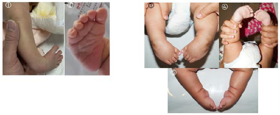 图1 ①②典型性特发性马蹄内翻足;③④⑤非典型性特发性马蹄内翻足