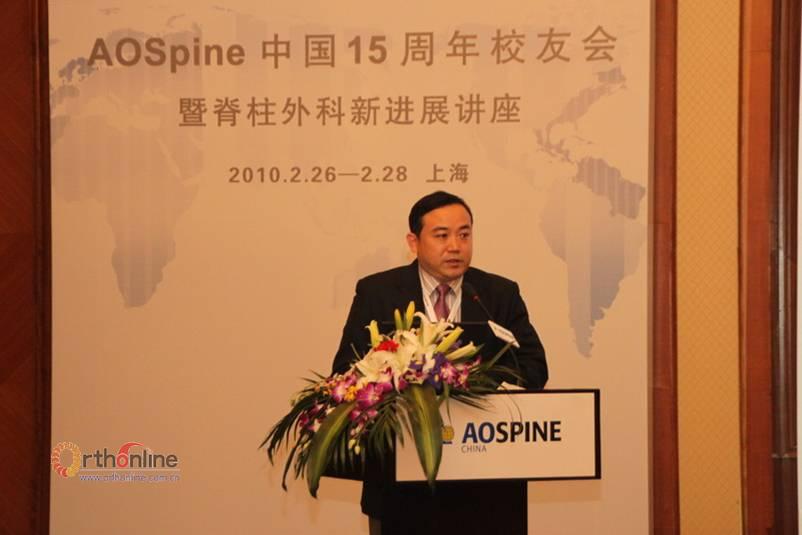 AOSpine作为一个专门研究脊柱病例的分支团体,2010年2月27日在上海举办了中国15周年校友会暨脊柱外科新进展学术会议。AOSpine创始人Mr. John Webb、以及中国理事会的党耕町、陈仲强、袁文、罗卓荆、贾连顺、刘尚礼、刘忠军、黄东生、陈德玉、姜建元、宋跃明、王以朋等教授出席了会议。来自全国的近160名校友也共同参加了这次盛会。
