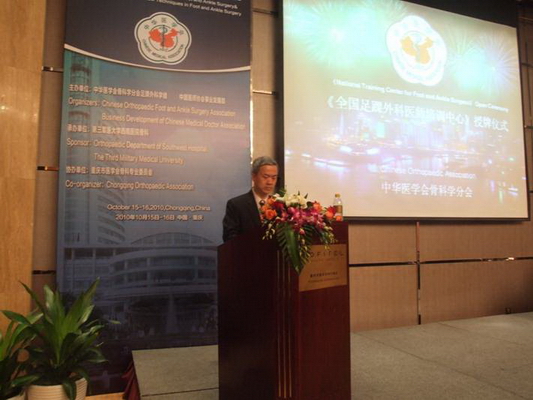 国际足踝外科联盟(IFFAS)主席Yoshinori Takakura教授代表国际足踝外科联盟对中华医学会“全国足踝外科医师培训中心”成立表示了热烈祝贺,并提出了一览子的国际合作计划。香港骨科协会会长Henrry Siu-Fai教授、欧洲前足踝外科协会主席Hajo Thermann教授、重庆市医学会骨科专业委员会主任委员蒋电明教授等发表了热情洋溢的讲话。