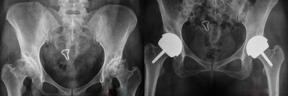 讨论:全髋关节置换术是已经相当成熟的一个手术,它对于老年性髋关节疾患能够明显改善髋关节疼痛和关节功能,畸形,特别是对于骨质疏松或股骨头有较大的囊性变患者具有明显的优越性,具有明显的优越性.但是,对于年轻患者,行全髋关节置换术后由于骨溶解和骨吸收而致假体松动问题,到目前为止还没有完全解决,从以往的经验看,往往需要行再次翻修术,手术的难度明显增加,并且发现部分行髋关节假体翻修的患者术后的髋关节功能没有达到预期的目的.对年纪轻的患者如何既能解决髋关节疾病的痛苦,而又保留更多的骨质成为一个相当重要的课题,而全髋关节表面置正是最大限度的保留了髋关节双侧的骨量,②最大限度保留了髋关节正常生物力学性能,避免了应力遮挡,从而减少了骨吸收,减小了假体松动的机会③术后恢复了正常解剖关系,稳定性好,很少发生脱位,④手术创伤小,不破坏股骨头的血运,⑥再次翻修的手术难度明显降低