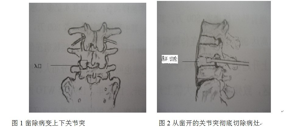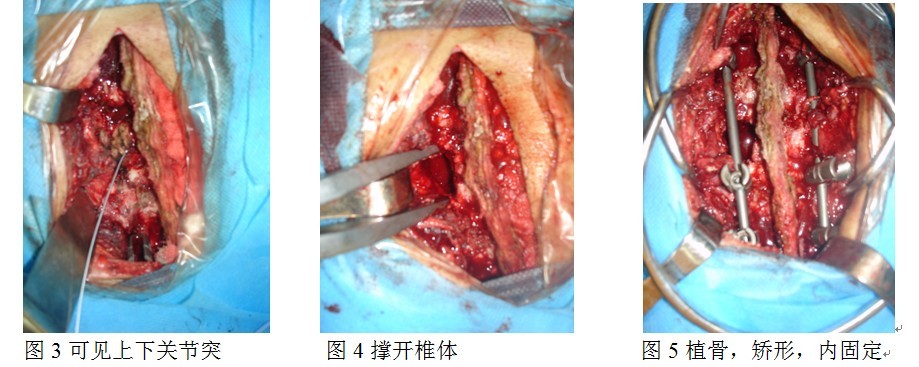 以病变椎体为中心,作一后正中切口,显露病椎棘突、椎板、关节突以及上下需要固定的正常椎体,根据后凸畸形的严重程度在C 型臂协助下确定进钉角度和方向,置入椎弓根钉,椎弓根钉固定的方法:病灶上下相邻正常椎体置入,当病椎骨质破坏不超过1/3或未累计椎弓根时置入相对较短的钉子,一般长度为35mm,当骶1椎体有破坏时,根据骨质的情况确定入钉的方向,将病椎上、下关节突关节切除,自椎间孔显露病灶,直视神经根状态下进行病灶清除和椎管减压,可将干酪样物,死骨,坏死的椎间盘大部分清除,解除硬膜囊的压迫,必要者可双侧同时病灶清除,减压。无钛棒状态下用椎体撑开器轻柔牵开,采用前路撑开结合后路固定维持有限撑开或加压缓慢矫正脊柱后凸畸形,特别注意是由于结核患者骨质疏松,不可用钉棒大力撑开,否则钉子拔出可能性较大。要前路撑开加后路加压来达到矫形的目的。撑开后,缺损空间增大,大部分用手指可触及缺损内的情况,能进一步彻底清除病灶及对侧的病灶,反复用异烟肼盐水混合液冲洗病灶,凿出植骨床,植骨时需注意植骨块要采用“平进竖植”方法,循序用植骨打入器和辅助器械缓慢植入否则易导致神经根损害。植骨完成后再次采用内固定适当加压促使骨块稳定及融合,如果病灶中的脓液稀薄较多时,在病灶中留置一根硬膜外管,术后注射异烟肼,每周两次,以提高局部的药物浓度,在对侧椎板,关节突间植骨,病灶内留置链霉素2.0g ,放置引流管,闭合伤口。