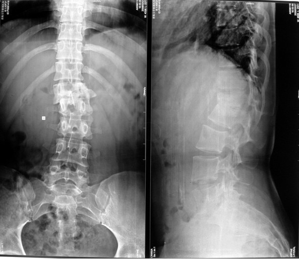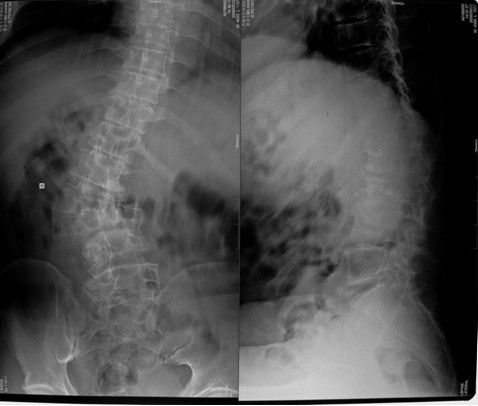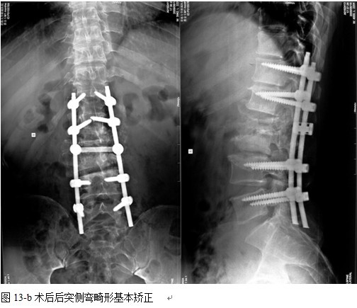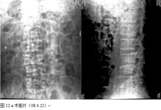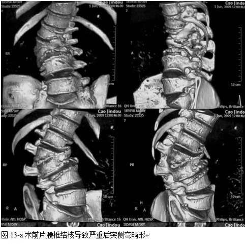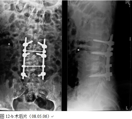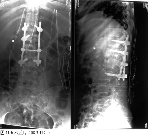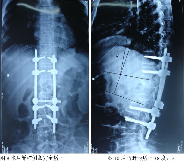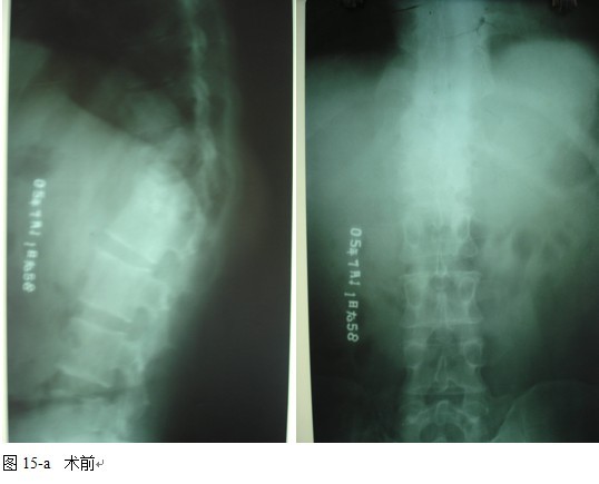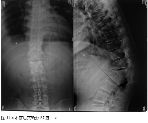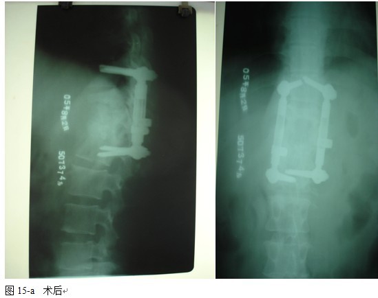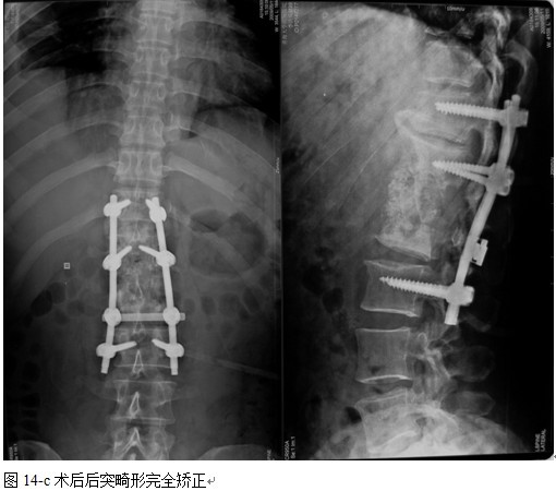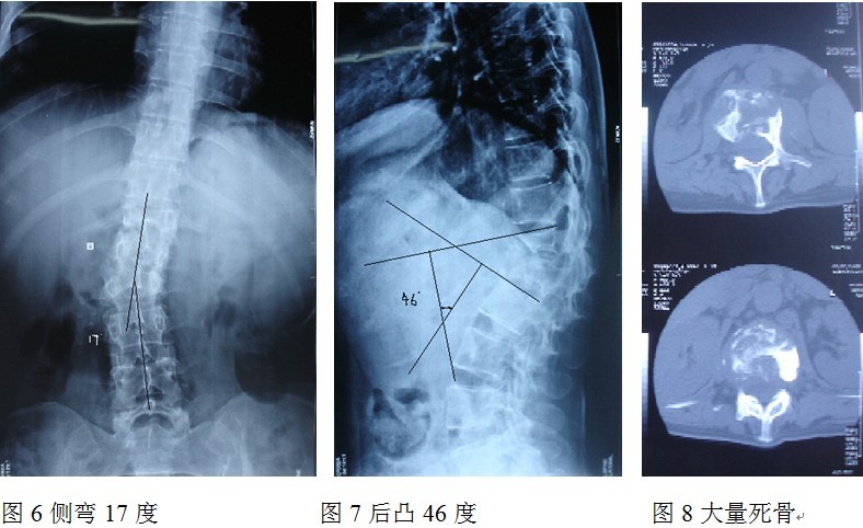 结果: 术后所有患者均显示,骨性融合, 马尾神经损伤的患者均基本恢复正常,术后后凸畸形平均矫正90%以上, 3-49个月的随访,后凸角度平均丢失4.2°。