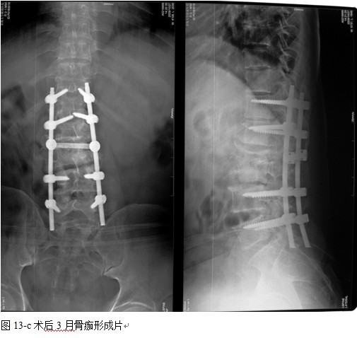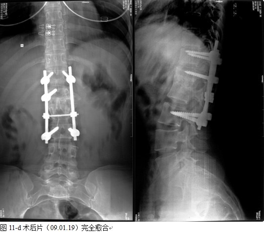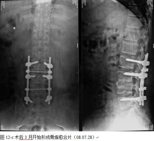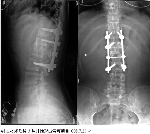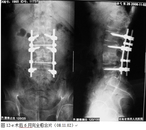 本组手术用时间3~4h , 平均3.5h 。术中出血300~500ml , 平均约350ml 。术后症状完全缓解,无神经功能障碍加重等并发症,1例营养差的老年患者伤口出现窦道,1例因肝功能差,术后未口服抗痨药,伤口出现窦道,经换药后二期愈合,其余病例伤口均一期愈合。马尾神经受损的患者术后基本恢复正常。术后一周后凸角平均 5.4°后凸畸形平均矫正90%以上, 最终后凸角平均8.3°,后凸角度平均丢失4.2°。随访3个月有87%(40/46)有骨痂形成,6个月91.3%(42/46)明显骨性愈合(见图),其余4例9-12个月内愈合,随访时间3-32个月,平均11个月,46例患者中2例在术后2个月和3个月时背部形成脓肿,换药后治愈。2例出院1月后并发结核性脑膜炎,治疗后好转。1例因椎弓根钉偏外,刺激神经根,5个月后从侧方脱出,疼痛加重,因前后路植骨完全愈合,取出后症状完全缓解。