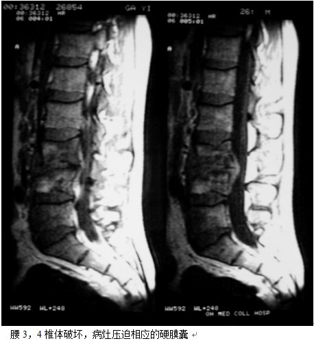 本组46例中男28 例,女18 例。年龄17~67岁,病程6 个月~7年,平均11.3 个月。本组患者均为 L1~S1腰段结核。病灶累及2 个椎体31例(L1-2 6例, L2-3 8例,L3-4 10例,L4-5 5例,L5-S1 2例),3 个或3 个以上椎体15例。合并腰大肌脓肿23列,所有患者均有腰背部疼痛,活动受限,双下肢感觉麻木19例,会阴部感觉减退12例,双下肢肌力减弱12例,腱反射减弱12例,术前后凸角(Cobb 角) <30°者12例, 30°~60°者28 例, >60°者6 例,Cobb角平均32.3°4例患者是二次手术。术前均行X线片、CT或者MRI检查。术后病理检查确诊为脊柱结核。