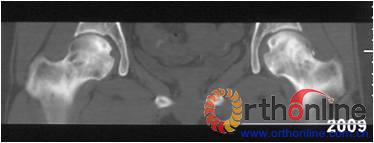 图3-1 女,31岁,SARS患者骨坏死,(1)MRI示双侧股骨头坏死,右Ⅱb(B型),左Ⅱc(C1型);(2)打压植骨术(未加BMP2)后坏死修复不完全,仍遗留股骨头软骨下病灶未完全修复, 5年随访关节功能优(Harris评分96分)