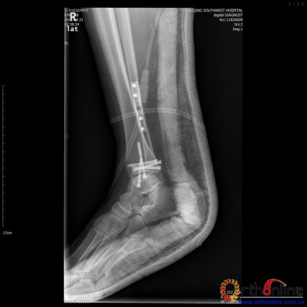 伤员和家属迅速赶到西南医院,10点关节外科段小军副教授查看伤员后急诊收入院,拍摄X片和急诊行三维CT重建检查,提示踝关节创伤严重,出现三踝骨折伴胫距关节脱位,需要急诊手术治疗。随后段教授与正在四川成都参加“汶川地震5周年灾害医学救治研讨会”的杨柳主任联系,进一步完善救治方案。地震当晚,段教授为该伤员进行急诊手术,手术顺利对复杂骨折进行了解剖复位,有效的钢板螺钉固定。术后伤员的疼痛明显缓解,复查X片,踝关节结构恢复满意。