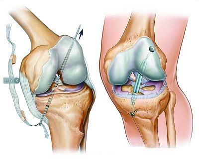 展示前十字韧带(ACL)修复技术的医学插画。该系列医学插画用在一家外国医疗媒体给病人发放的教育图册上。